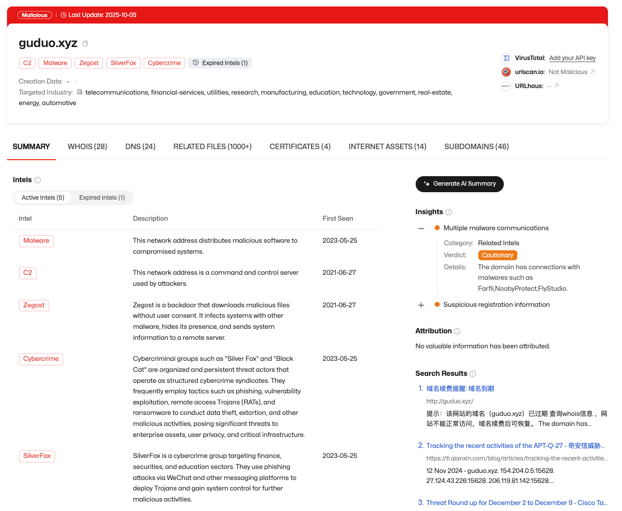 Our analysis indicates that the domains guduo.ga and guduo.xyz were first observed in 2020. Based on their characteristics, we assess with moderate confidence that they are testbed domains—likely artifacts used by the developer/packer maintainer for anti-detection (AV evasion) testing during builds.